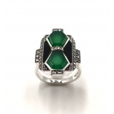 BAGUE ARGENT 925 (AGATE VERTE - ONYX - MARCASSITES)